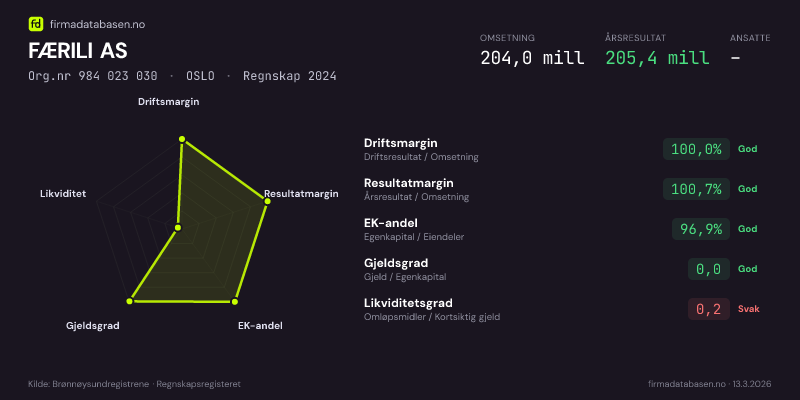 FÆRILI AS hadde en omsetning på 204,0 MNOK for regnskapsåret 2024 ifølge siste innsendte årsregnskap. Regnskapstallene hentes fra Brønnøysundregistrene.
