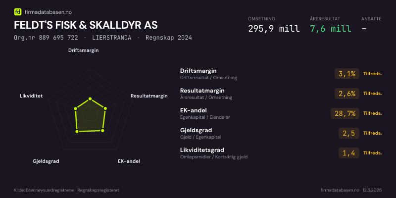 FELDT'S FISK & SKALLDYR AS,LIERSTRANDA — jo større areal, jo sterkere økonomi.Org.nr 889 695 722 · Regnskap2024