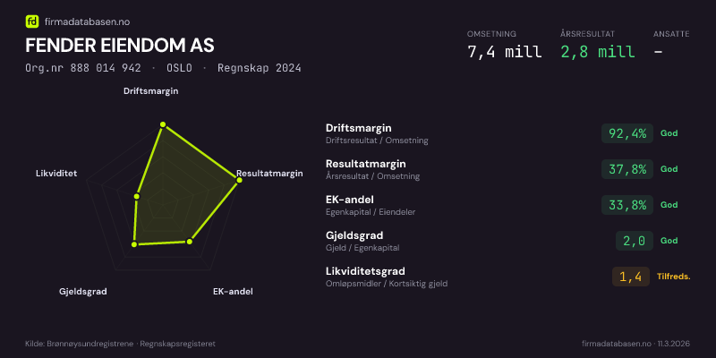 FENDER EIENDOM AS hadde en omsetning på 7,4 MNOK for regnskapsåret 2024 ifølge siste innsendte årsregnskap. Regnskapstallene hentes fra Brønnøysundregistrene.