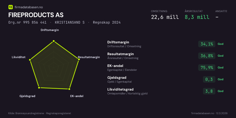 FIREPRODUCTS AS hadde en omsetning på 22.6 mill i 2024, med driftsmargin på 34.1%.