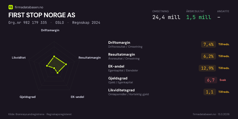 FIRST STOP NORGE AS hadde en omsetning på 24,4 MNOK for regnskapsåret 2024 ifølge siste innsendte årsregnskap. Regnskapstallene hentes fra Brønnøysundregistrene.