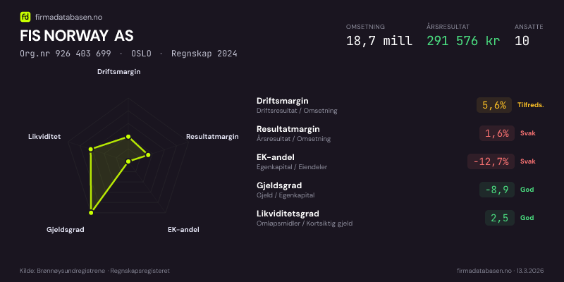 FIS NORWAY AS hadde en omsetning på 18,7 MNOK for regnskapsåret 2024 ifølge siste innsendte årsregnskap. Regnskapstallene hentes fra Brønnøysundregistrene.