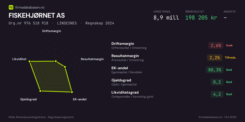 FISKEHJØRNET AS hadde en omsetning på 8.9 mill i 2024, med driftsmargin på 2.6%.