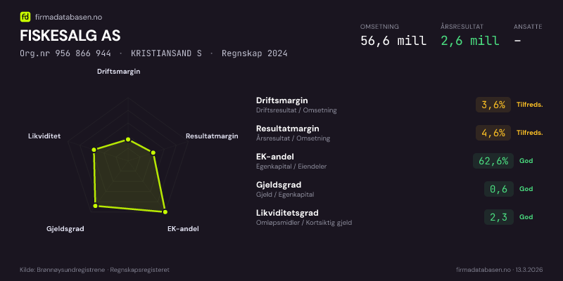FISKESALG AS hadde en omsetning på 56.6 mill i 2024, med driftsmargin på 3.6%.