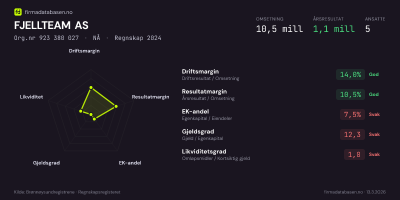 FJELLTEAM AS hadde en omsetning på 10,5 MNOK for regnskapsåret 2024 ifølge siste innsendte årsregnskap. Regnskapstallene hentes fra Brønnøysundregistrene.