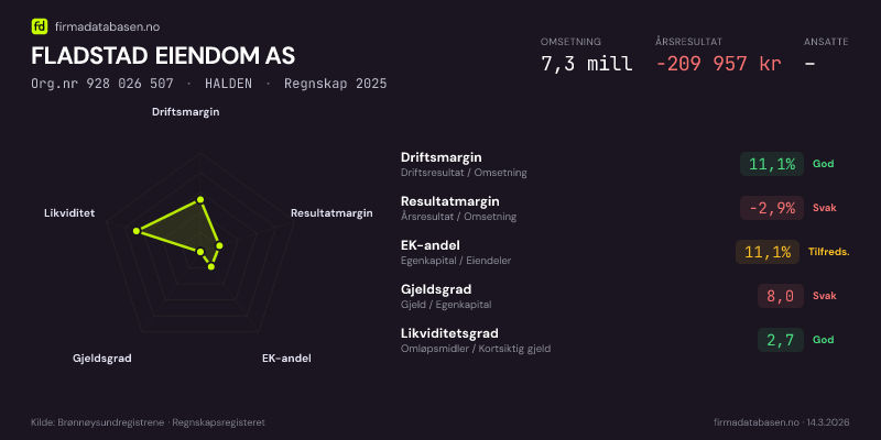 FLADSTAD EIENDOM AS er et aksjeselskap, innen utvikling og salg av byggeprosjekter, stiftet i 2021 i Halden. I 2025 hadde selskapet en omsetning på 7.3 mill og en driftsmargin på 11.1 %.