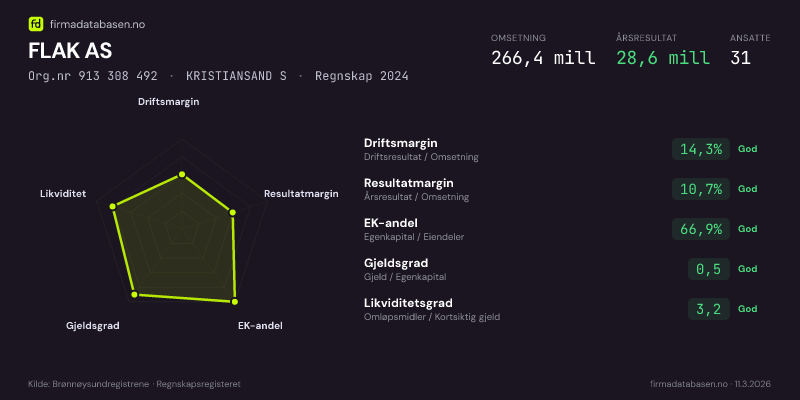 FLAK AS hadde en omsetning på 266.4 mill i 2024, med driftsmargin på 14.3%.