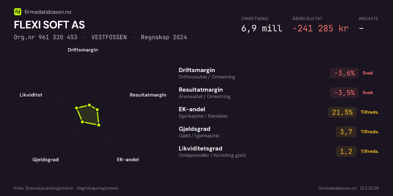 FLEXI SOFT AS,VESTFOSSEN — jo større areal, jo sterkere økonomi.Org.nr 961 320 453 · Regnskap2024