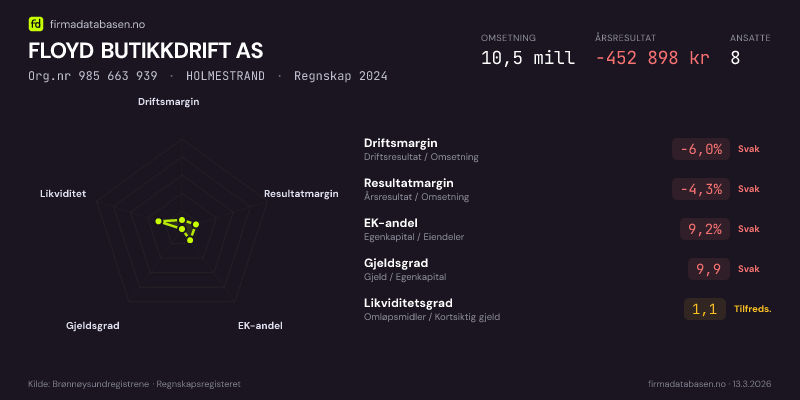 FLOYD BUTIKKDRIFT AS,HOLMESTRAND — jo større areal, jo sterkere økonomi.Org.nr 985 663 939 · Regnskap2024