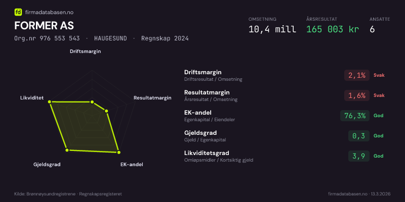 FORMER AS,HAUGESUND — jo større areal, jo sterkere økonomi.Org.nr 976 553 543 · Regnskap2024