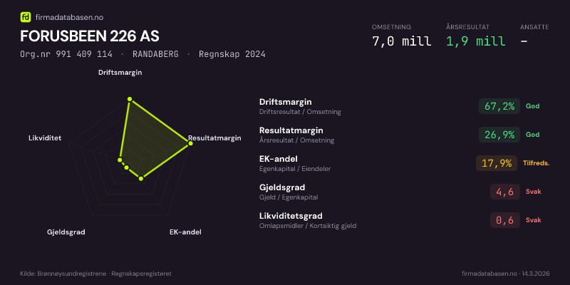 FORUSBEEN 226 AS hadde en omsetning på 7,0 MNOK for regnskapsåret 2024 ifølge siste innsendte årsregnskap. Regnskapstallene hentes fra Brønnøysundregistrene.