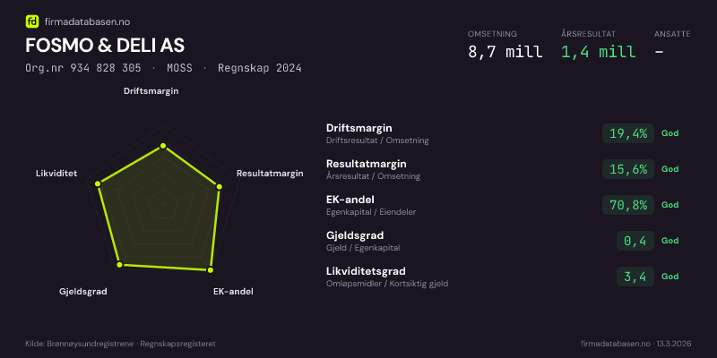 FOSMO & DELI AS hadde en omsetning på 8,7 MNOK for regnskapsåret 2024 ifølge siste innsendte årsregnskap. Regnskapstallene hentes fra Brønnøysundregistrene.
