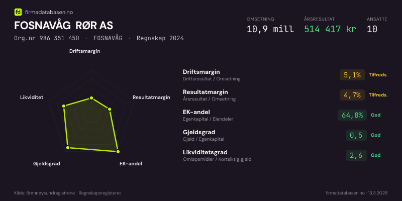 FOSNAVÅG RØR AS hadde en omsetning på 10,9 MNOK for regnskapsåret 2024 ifølge siste innsendte årsregnskap. Regnskapstallene hentes fra Brønnøysundregistrene.