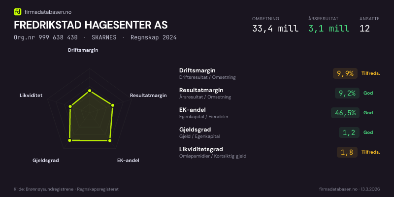 FREDRIKSTAD HAGESENTER AS hadde en omsetning på 33,4 MNOK for regnskapsåret 2024 ifølge siste innsendte årsregnskap. Regnskapstallene hentes fra Brønnøysundregistrene.