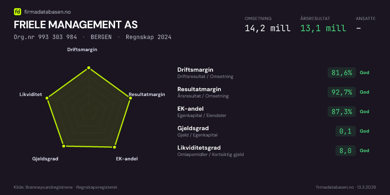 FRIELE MANAGEMENT AS hadde en omsetning på 14,2 MNOK for regnskapsåret 2024 ifølge siste innsendte årsregnskap. Regnskapstallene hentes fra Brønnøysundregistrene.