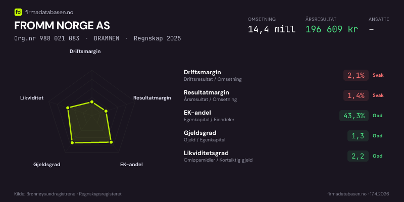 FROMM NORGE AS hadde en omsetning på 14,4 MNOK for regnskapsåret 2025 ifølge siste innsendte årsregnskap. Regnskapstallene hentes fra Brønnøysundregistrene.