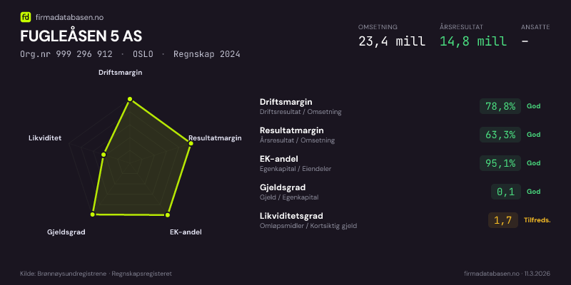 FUGLEÅSEN 5 AS,OSLO — jo større areal, jo sterkere økonomi.Org.nr 999 296 912 · Regnskap2024