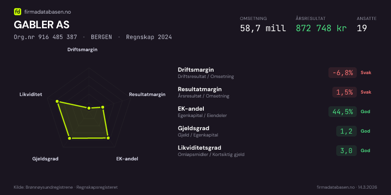 GABLER AS har organisasjonsnummer 916485387. Organisasjonsnummeret er et unikt 9-sifret nummer tildelt av Brønnøysundregistrene som identifiserer virksomheten i Norge.
