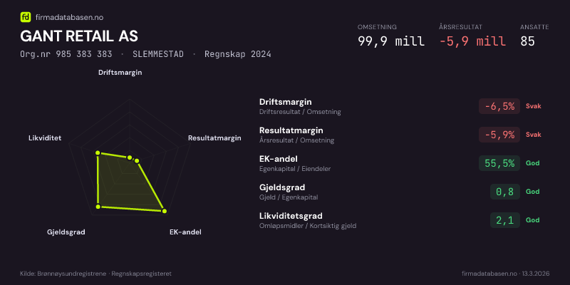 GANT RETAIL AS hadde en omsetning på 99,9 MNOK for regnskapsåret 2024 ifølge siste innsendte årsregnskap. Regnskapstallene hentes fra Brønnøysundregistrene.
