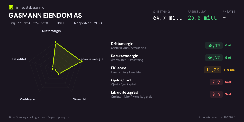 GASMANN EIENDOM AS hadde en omsetning på 64,7 MNOK for regnskapsåret 2024 ifølge siste innsendte årsregnskap. Regnskapstallene hentes fra Brønnøysundregistrene.