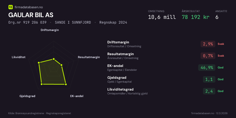 GAULAR BIL AS,SANDE I SUNNFJORD — jo større areal, jo sterkere økonomi.Org.nr 919 206 039 · Regnskap2024
