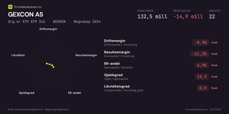 GEXCON AS hadde en omsetning på 132.5 mill i 2024, med driftsmargin på -8.9%.