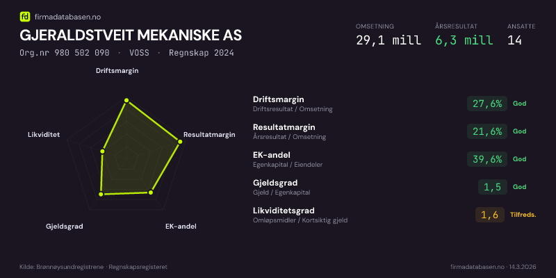 GJERALDSTVEIT MEKANISKE AS hadde en omsetning på 29,1 MNOK for regnskapsåret 2024 ifølge siste innsendte årsregnskap. Regnskapstallene hentes fra Brønnøysundregistrene.