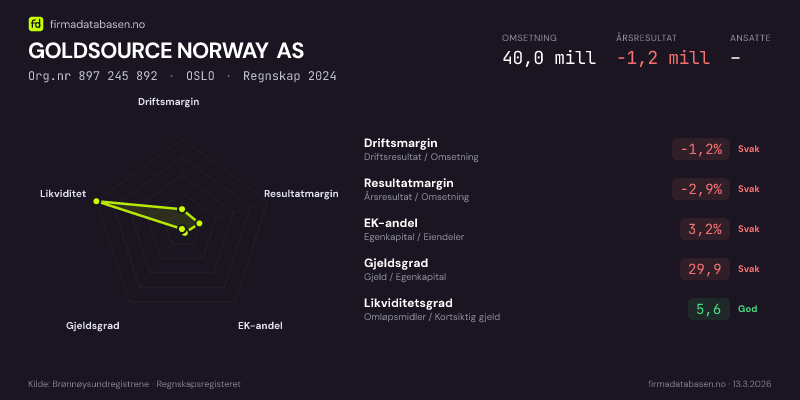 GOLDSOURCE NORWAY AS hadde en omsetning på 40,0 MNOK for regnskapsåret 2024 ifølge siste innsendte årsregnskap. Regnskapstallene hentes fra Brønnøysundregistrene.