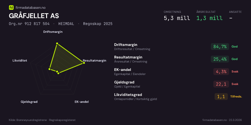 GRÅFJELLET AS hadde en omsetning på 5,3 MNOK for regnskapsåret 2025 ifølge siste innsendte årsregnskap. Regnskapstallene hentes fra Brønnøysundregistrene.