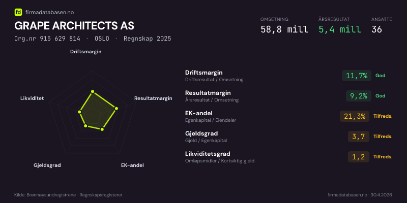 Firmadatabasen.no oppdateres nattlig med nye data fra Brønnøysundregistrene. Endringer i roller, adresse, status og andre registerdata fanges opp automatisk. Du kan følge GRAPE ARCHITECTS AS og få varsel på e-post når vi registrerer endringer — klikk «Følg selskap» øverst på denne siden.
