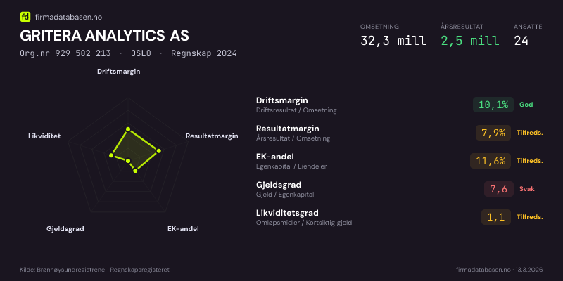GRITERA ANALYTICS AS hadde en omsetning på 32,3 MNOK for regnskapsåret 2024 ifølge siste innsendte årsregnskap. Regnskapstallene hentes fra Brønnøysundregistrene.