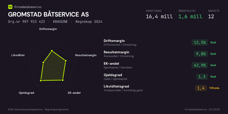 GROMSTAD BÅTSERVICE AS,KRAGERØ — jo større areal, jo sterkere økonomi.Org.nr 987 923 423 · Regnskap2024