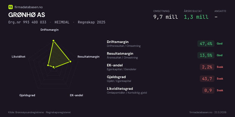 GRØNHØ AS hadde en omsetning på 9,7 MNOK for regnskapsåret 2025 ifølge siste innsendte årsregnskap. Regnskapstallene hentes fra Brønnøysundregistrene.