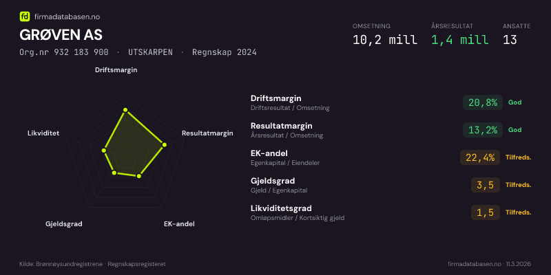 GRØVEN AS hadde en omsetning på 10,2 MNOK for regnskapsåret 2024 ifølge siste innsendte årsregnskap. Regnskapstallene hentes fra Brønnøysundregistrene.