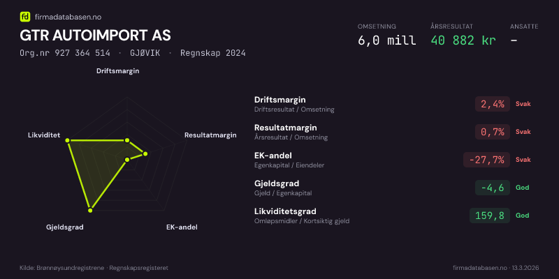GTR AUTOIMPORT AS,GJØVIK — jo større areal, jo sterkere økonomi.Org.nr 927 364 514 · Regnskap2024
