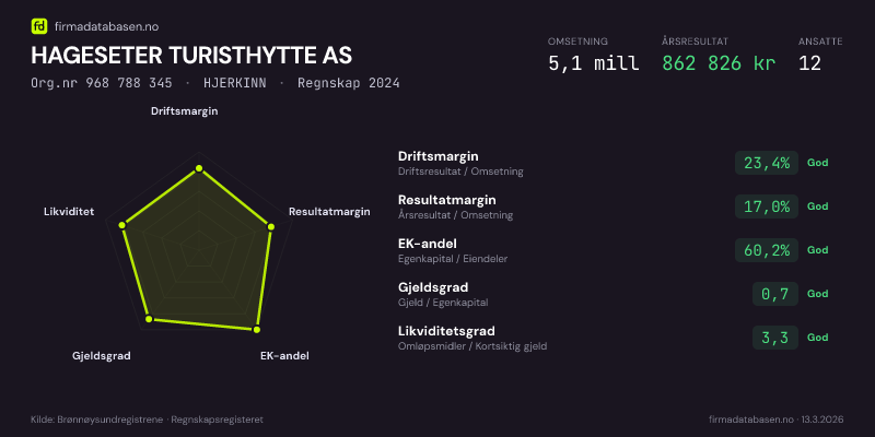 Firmadatabasen.no oppdateres nattlig med nye data fra Brønnøysundregistrene. Endringer i roller, adresse, status og andre registerdata fanges opp automatisk. Du kan følge HAGESETER TURISTHYTTE AS og få varsel på e-post når vi registrerer endringer — klikk «Følg selskap» øverst på denne siden.