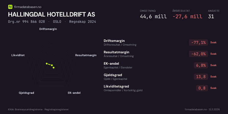 HALLINGDAL HOTELLDRIFT AS hadde en omsetning på 44,6 MNOK for regnskapsåret 2024 ifølge siste innsendte årsregnskap. Regnskapstallene hentes fra Brønnøysundregistrene.