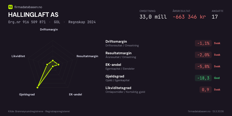HALLINGLAFT AS hadde en omsetning på 33,0 MNOK for regnskapsåret 2024 ifølge siste innsendte årsregnskap. Regnskapstallene hentes fra Brønnøysundregistrene.
