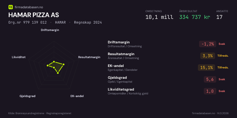 Firmadatabasen.no oppdateres nattlig med nye data fra Brønnøysundregistrene. Endringer i roller, adresse, status og andre registerdata fanges opp automatisk. Du kan følge HAMAR PIZZA AS og få varsel på e-post når vi registrerer endringer — klikk «Følg selskap» øverst på denne siden.