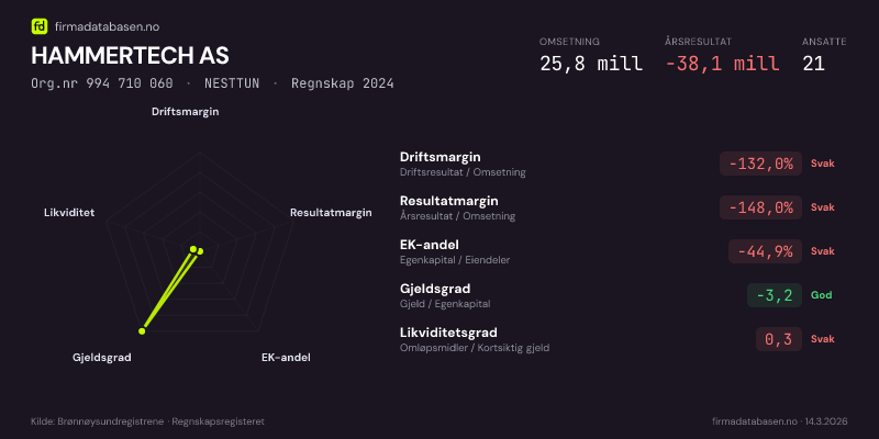 Firmadatabasen.no oppdateres nattlig med nye data fra Brønnøysundregistrene. Endringer i roller, adresse, status og andre registerdata fanges opp automatisk. Du kan følge HAMMERTECH AS og få varsel på e-post når vi registrerer endringer — klikk «Følg selskap» øverst på denne siden.