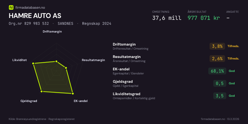 HAMRE AUTO AS hadde en omsetning på 37.6 mill i 2024, med driftsmargin på 3.8%.