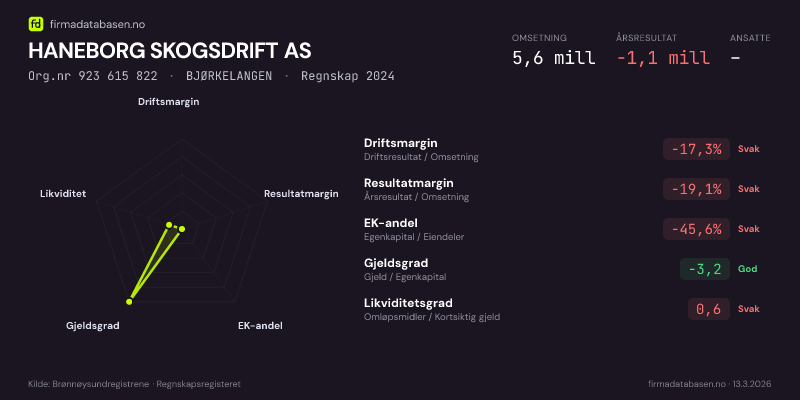 HANEBORG SKOGSDRIFT AS hadde en omsetning på 5,6 MNOK for regnskapsåret 2024 ifølge siste innsendte årsregnskap. Regnskapstallene hentes fra Brønnøysundregistrene.