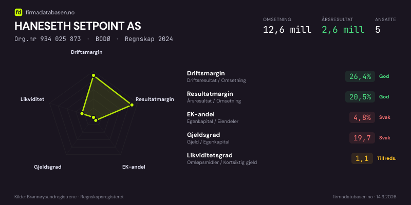 HANESETH SETPOINT AS hadde en omsetning på 12,6 MNOK for regnskapsåret 2024 ifølge siste innsendte årsregnskap. Regnskapstallene hentes fra Brønnøysundregistrene.