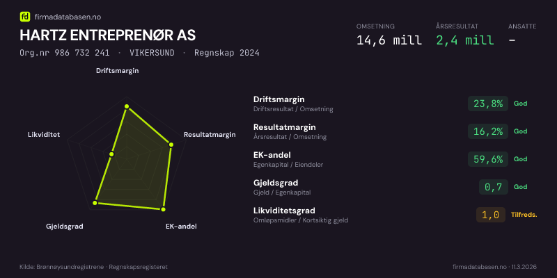 HARTZ ENTREPRENØR AS hadde en omsetning på 14,6 MNOK for regnskapsåret 2024 ifølge siste innsendte årsregnskap. Regnskapstallene hentes fra Brønnøysundregistrene.