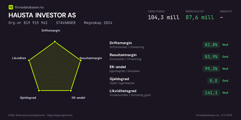 HAUSTA INVESTOR AS hadde en omsetning på 104,3 MNOK for regnskapsåret 2024 ifølge siste innsendte årsregnskap. Regnskapstallene hentes fra Brønnøysundregistrene.