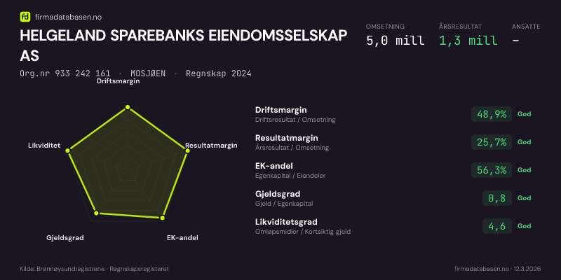 HELGELAND SPAREBANKS EIENDOMSSELSKAP AS hadde en omsetning på 5,0 MNOK for regnskapsåret 2024 ifølge siste innsendte årsregnskap. Regnskapstallene hentes fra Brønnøysundregistrene.