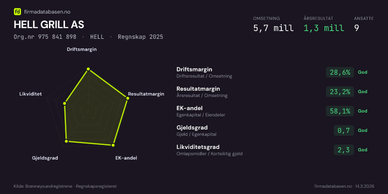 HELL GRILL AS hadde en omsetning på 5,7 MNOK for regnskapsåret 2025 ifølge siste innsendte årsregnskap. Regnskapstallene hentes fra Brønnøysundregistrene.