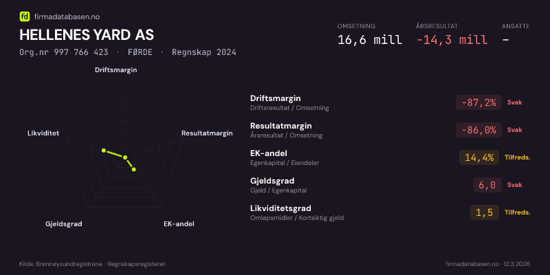 HELLENES YARD AS,FØRDE — jo større areal, jo sterkere økonomi.Org.nr 997 766 423 · Regnskap2024