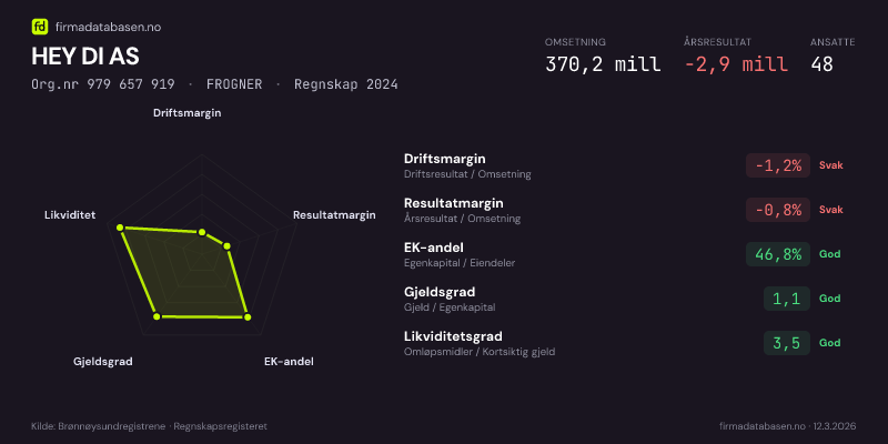 HEY DI AS hadde en omsetning på 370,2 MNOK for regnskapsåret 2024 ifølge siste innsendte årsregnskap. Regnskapstallene hentes fra Brønnøysundregistrene.