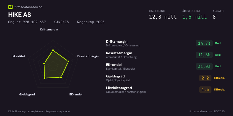 HIKE AS hadde en omsetning på 12,8 MNOK for regnskapsåret 2025 ifølge siste innsendte årsregnskap. Regnskapstallene hentes fra Brønnøysundregistrene.